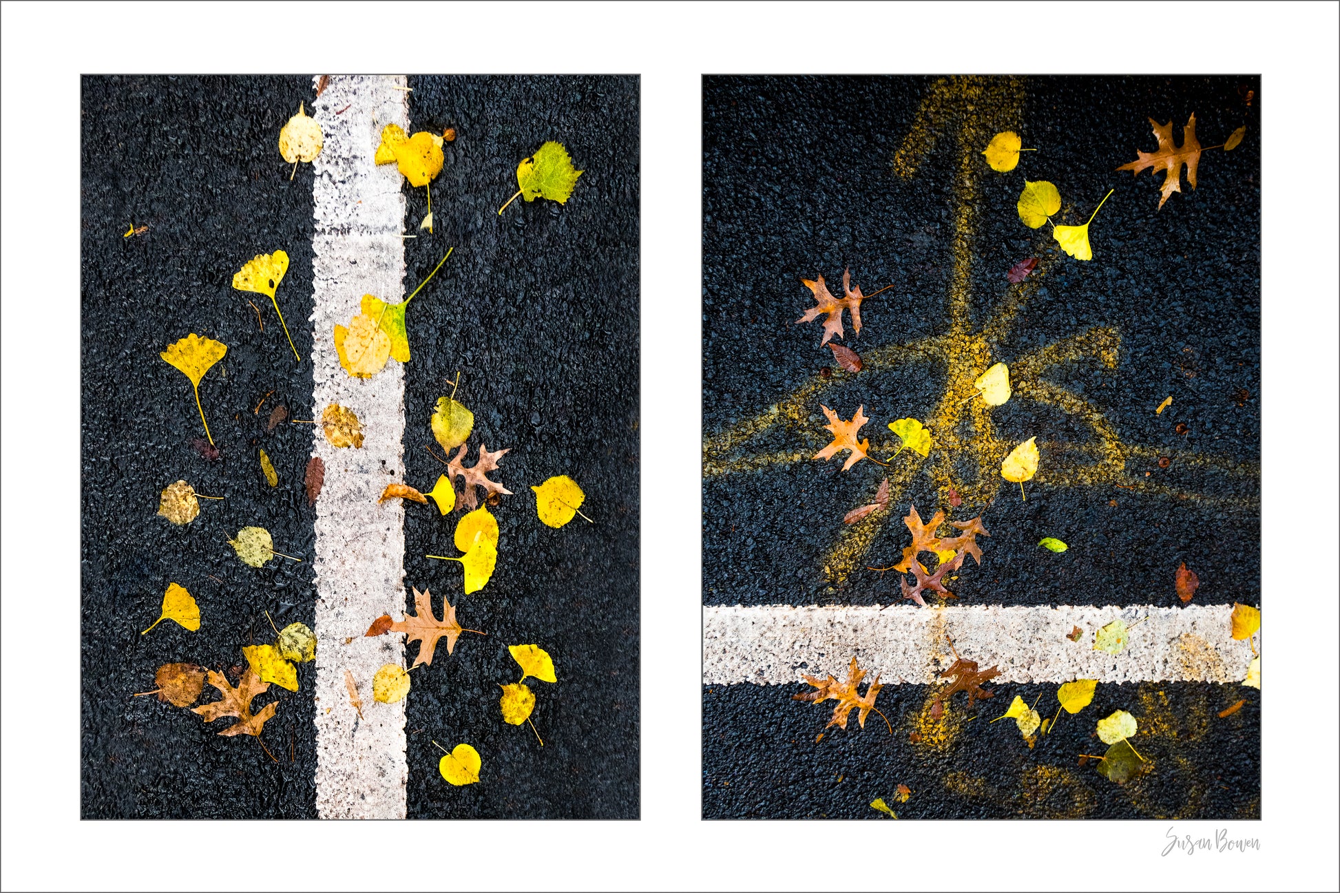 A pair of autumn moments gathered from the street—bright yellow leaves drifting across crisp white lines and utility marks.